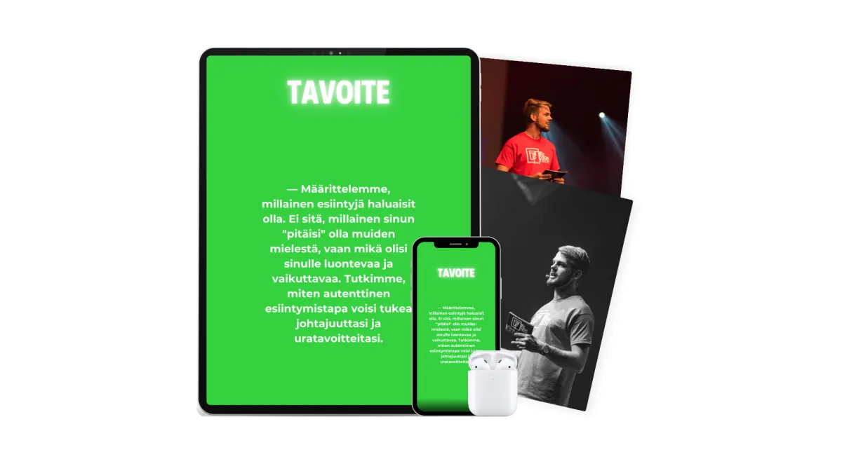 Selkeä polku vaikuttavaan esiintymiseen – Saat henkilökohtaisen etenemissuunnitelman ja välittömästi käyttöönotettavia työkaluja, joilla rakennat viestisi niin, että se todella tavoittaa yleisösi ja johtaa toivottuun vaikutukseen.