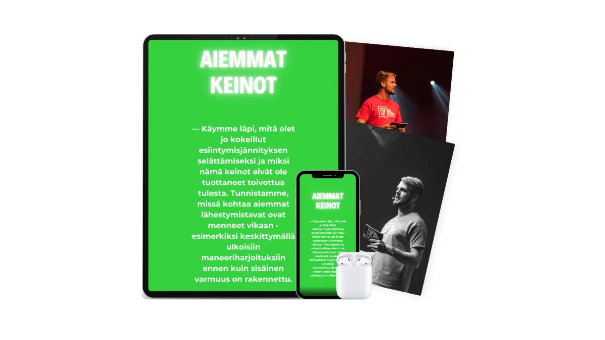 Käymme läpi, mitä olet jo kokeillut esiintymisjännityksen selättämiseksi ja vakuuttavuutesi lisäämiseksi, ja miksi nämä keinot eivät ole tuottaneet toivottua tulosta. Tunnistamme, missä kohtaa aiemmat lähestymistavat ovat menneet vikaan - esimerkiksi keskittymällä ulkoisiin maneeriharjoituksiin, ennen kuin sisäinen varmuus on rakennettu.