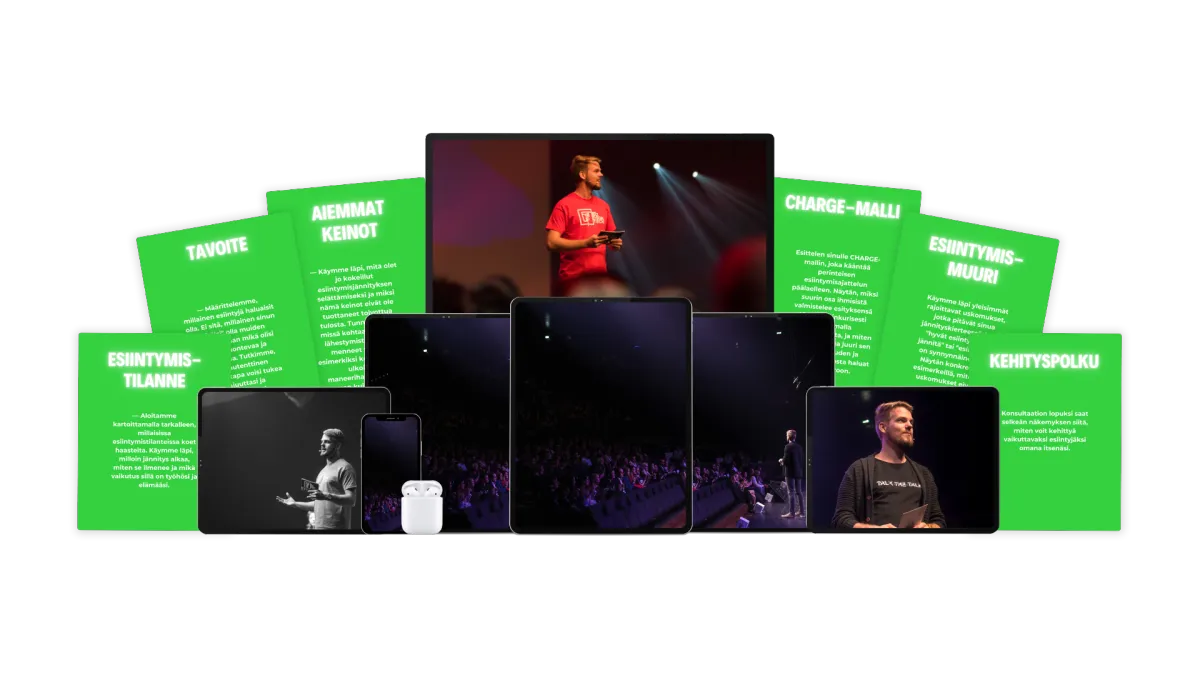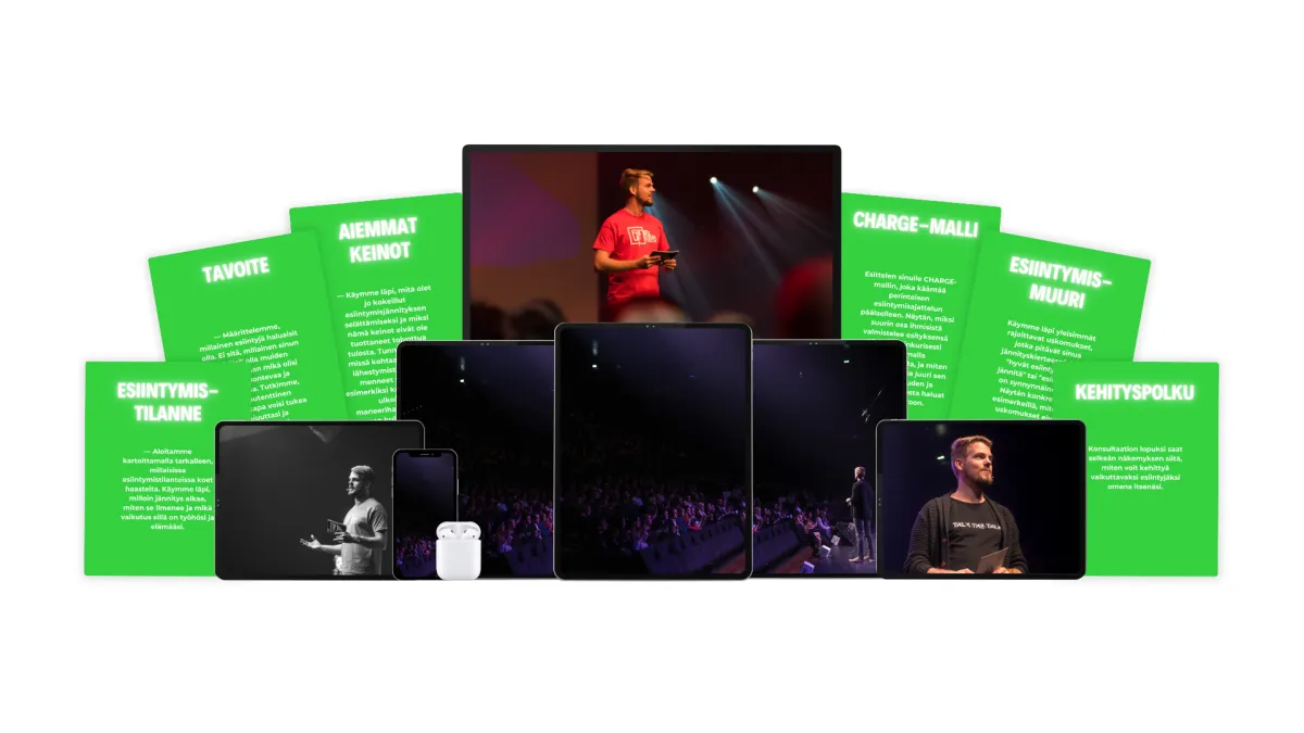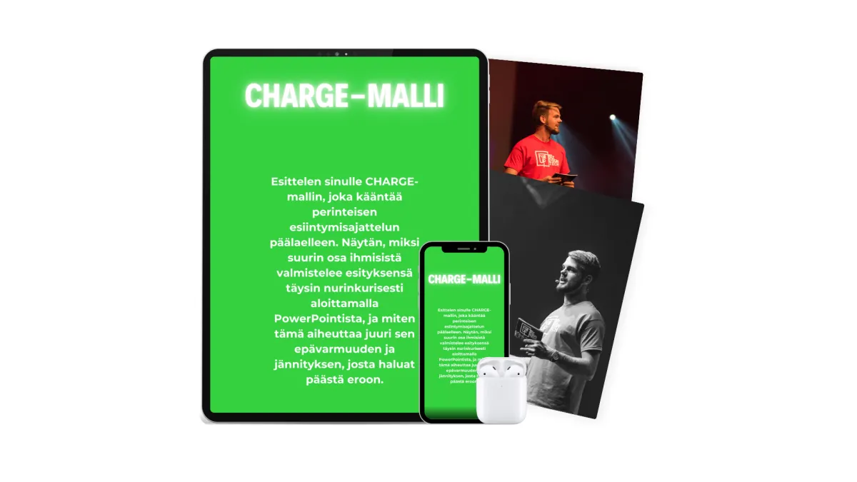 CHARGE-malli on nimenomaan käytännönläheinen prosessi, ei vain teoria. Se syntyi Miikan vuosien kokemuksesta TEDx-puhujien, startup-yrittäjien ja asiantuntijoiden valmentajana. Kuten Ville S. kertoi: "Aiemmin (ja nykyäänkin) esitykseni rakenne tulee vahvasti intuition kautta, mutta valmennuksen aikana saamani vinkit ja työkalut ovat nopeuttaneet esitykseni laatimista ja auttaneet minua täsmentämään esityksien ydinviestiä." Saat konkreettisia työkaluja esityksen rakenteen suunnitteluun, avainkysymyksiä ydinviestin kirkastamiseen, harjoitteita jännityksen hallintaan ja paljon muuta. Näillä työkaluilla rakennat itsellesi toimivan prosessin, jota voit soveltaa kaikissa esiintymistilanteissa.